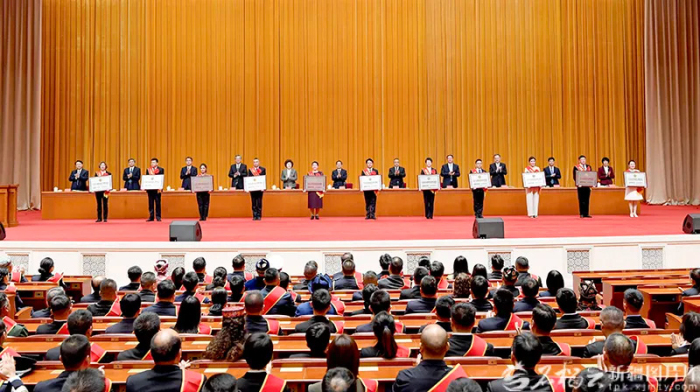 在欢快的乐曲声中,陈小江等领导同志为模范集体和模范个人代表颁发奖牌、荣誉证书和奖章。